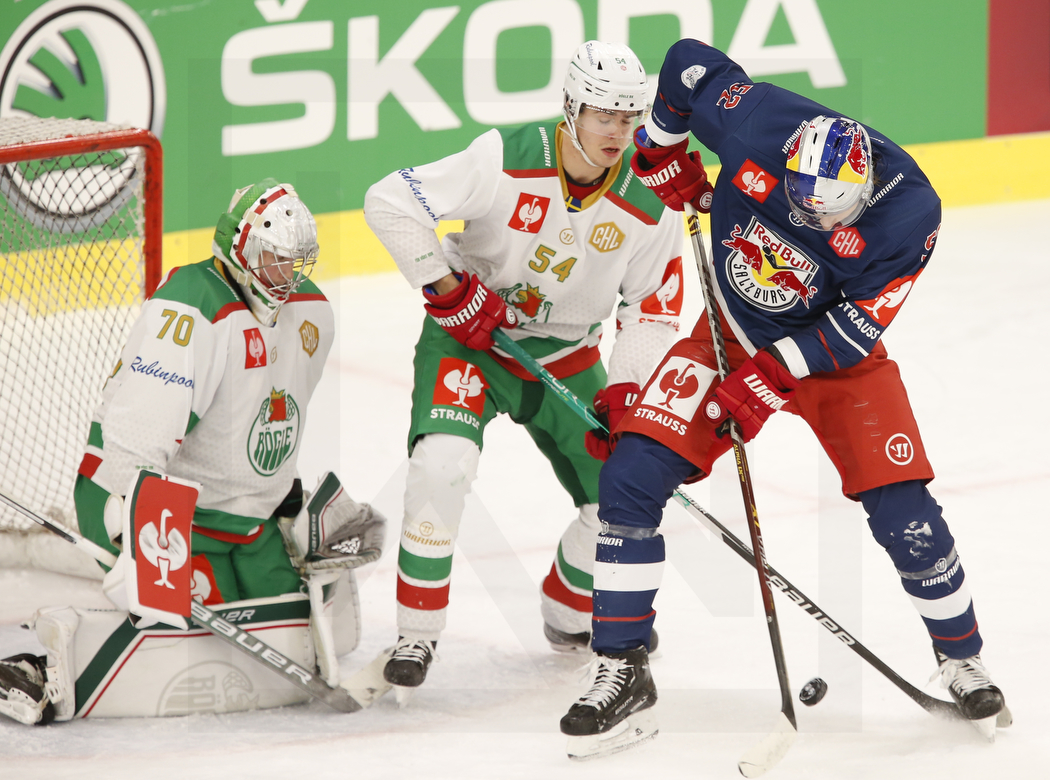 SALZBURG, AUSTRIA, 15.Nov. 2022 – EC Red Bull Salzburg vs. Rögle Ängelholm. Image shows Calle CLANG #70 (Rögle Ängelholm), William WALLINDER #54 (Rögle Ängelholm) & Paul HUBER #52 (EC Red Bull Salzburg). Photo: Werner Krainbucher