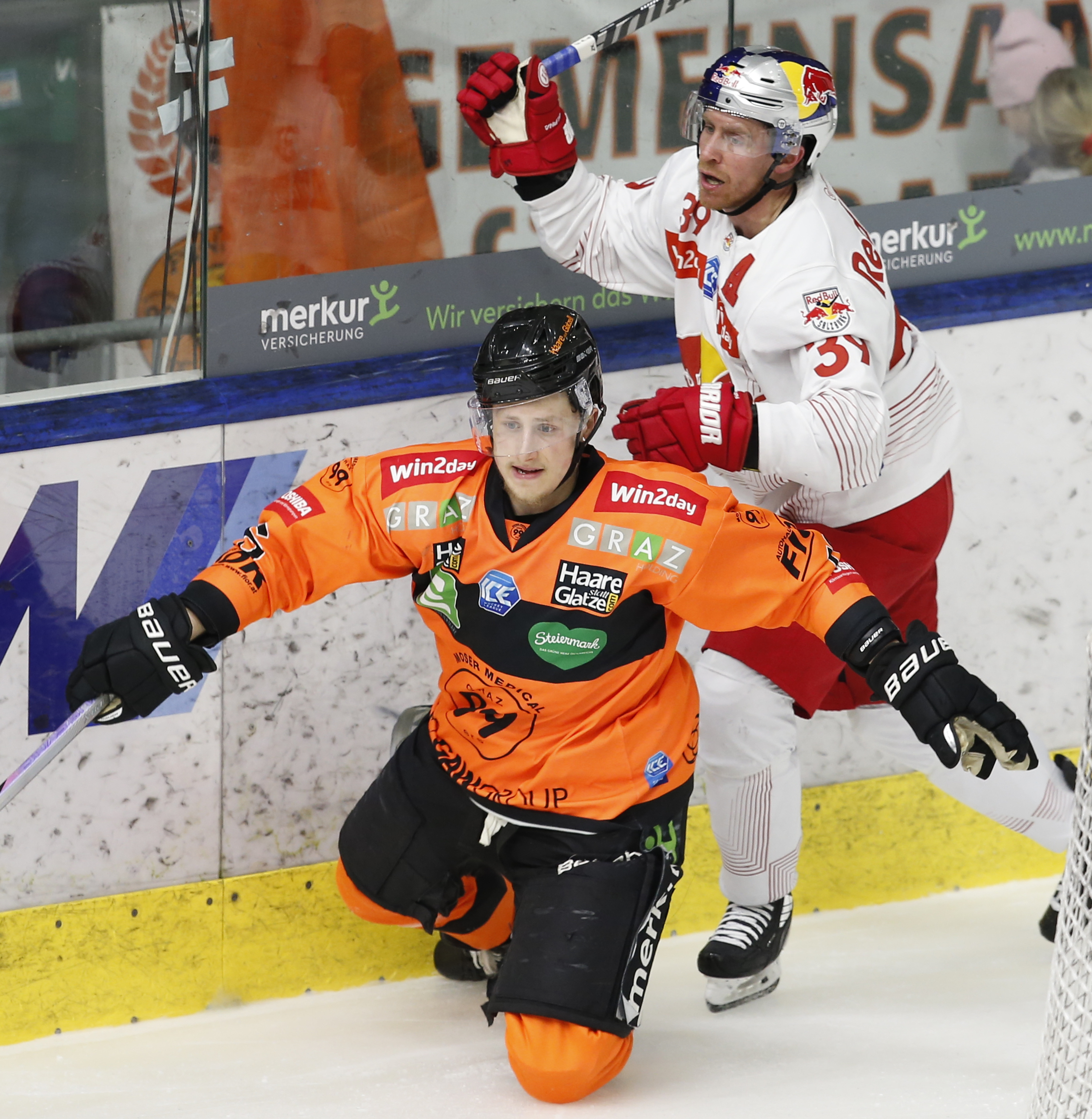 GRAZ, AUSTRIA, 19.Feb. 2023 – Moser Medical Graz 99ers vs. EC Red Bull Salzburg . Image shows Sam ANTONITSCH #76 (Moser Medical Graz 99ers) & Chay GENOWAY #39 (EC Red Bull Salzburg). Photo: Werner Krainbucher