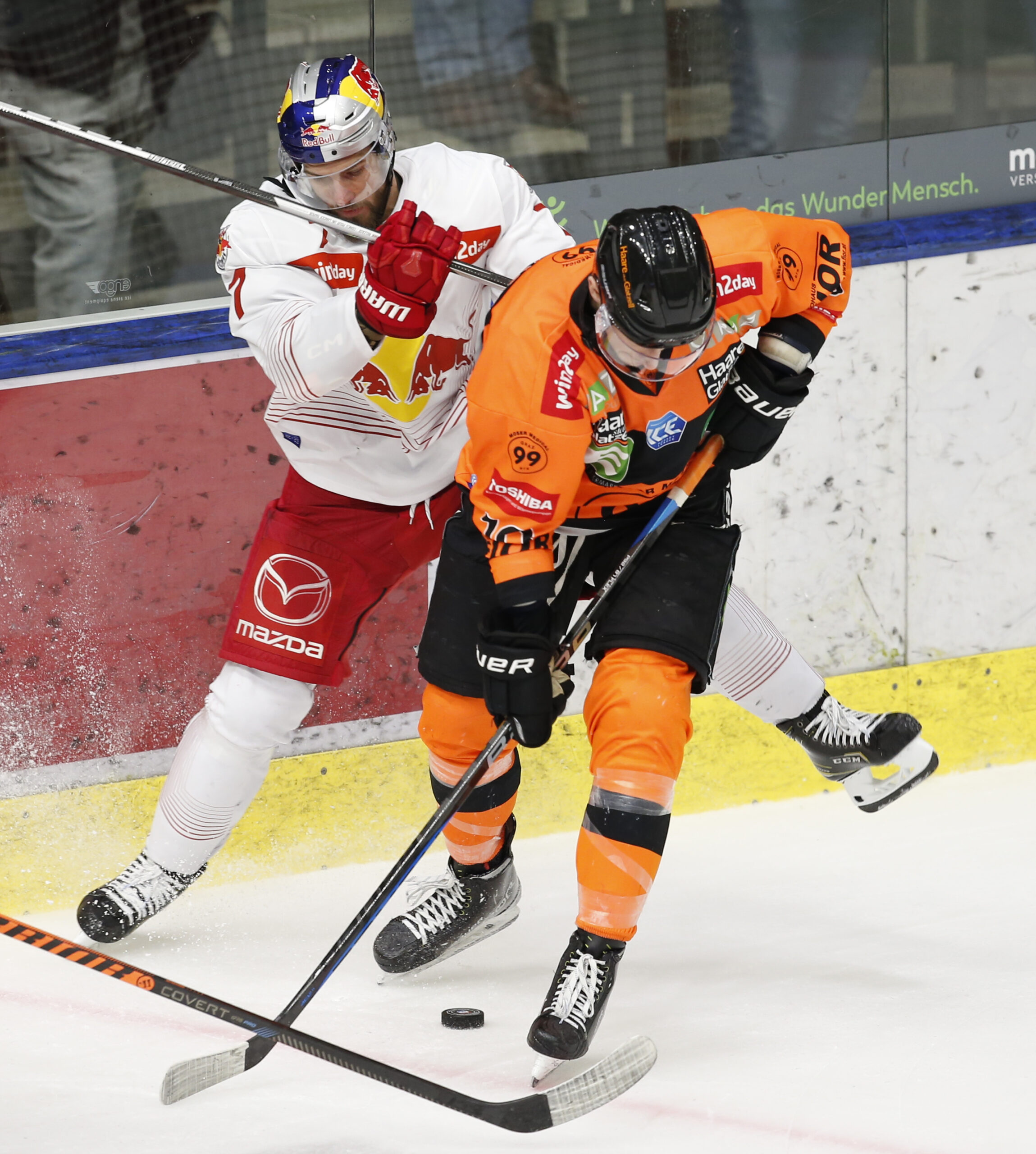 GRAZ, AUSTRIA, 19.Feb. 2023 – Moser Medical Graz 99ers vs. EC Red Bull Salzburg . Image shows Martin STAJNOCH #7 (EC Red Bull Salzburg) & Zintis ZUSEVICS #10 (Moser Medical Graz 99ers). Photo: Werner Krainbucher