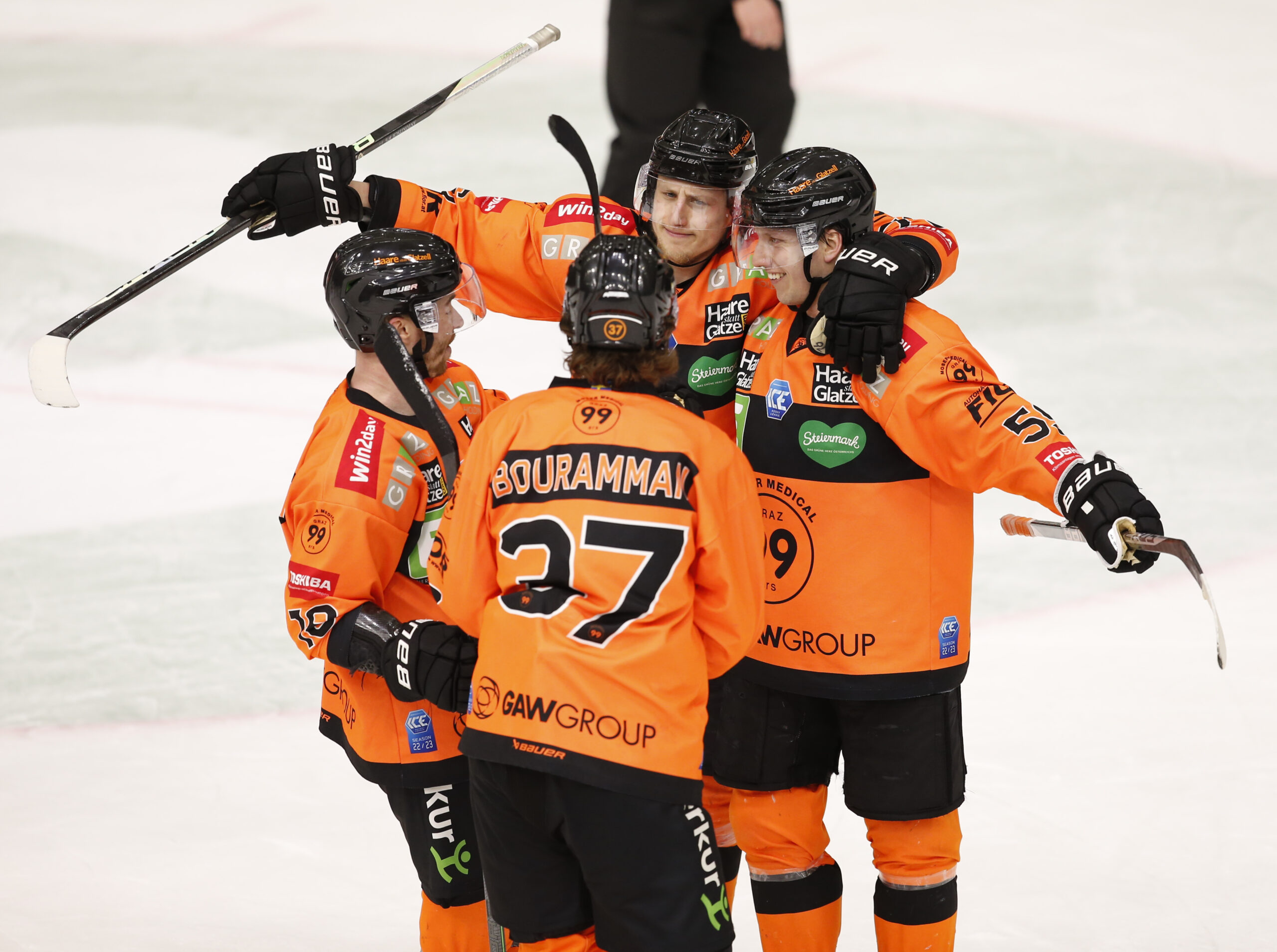 WK20230219_0578 19. Februar 2023 2560 × 1909 WK20230219_0578 GRAZ, AUSTRIA, 19.Feb. 2023 – Moser Medical Graz 99ers vs. EC Red Bull Salzburg . Image shows 99ers goal celebration. Photo: Werner Krainbucher