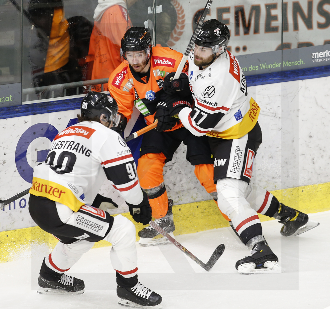 GRAZ, AUSTRIA, 26.Feb. 2023 – Moser Medical Graz 99ers vs. Bemer Pioneers Vorarlberg. Image shows Alexander PALLESTRANG #90 (Bemer Pioneers Vorarlberg), Ken OGRAJENSEK #18 (Moser Medical Graz 99ers) & Ivan KORECKY #77 (Bemer Pioneers Vorarlberg). Photo: Werner Krainbucher