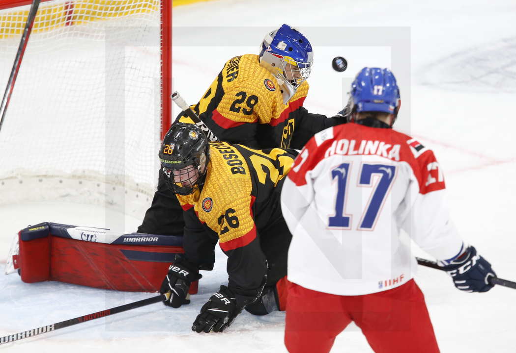 PORRENTRUY, SWITZERLAND, 22.Apr. 2023 – U18 World’s; GER vs. CZE. Image shows Lars BOSECKER #26 (Germany), Valentin ANKIRCHNER #29 (Germany) 6 Miroslav HOLINKA #17 (Czech Republic). Photo: Werner Krainbucher