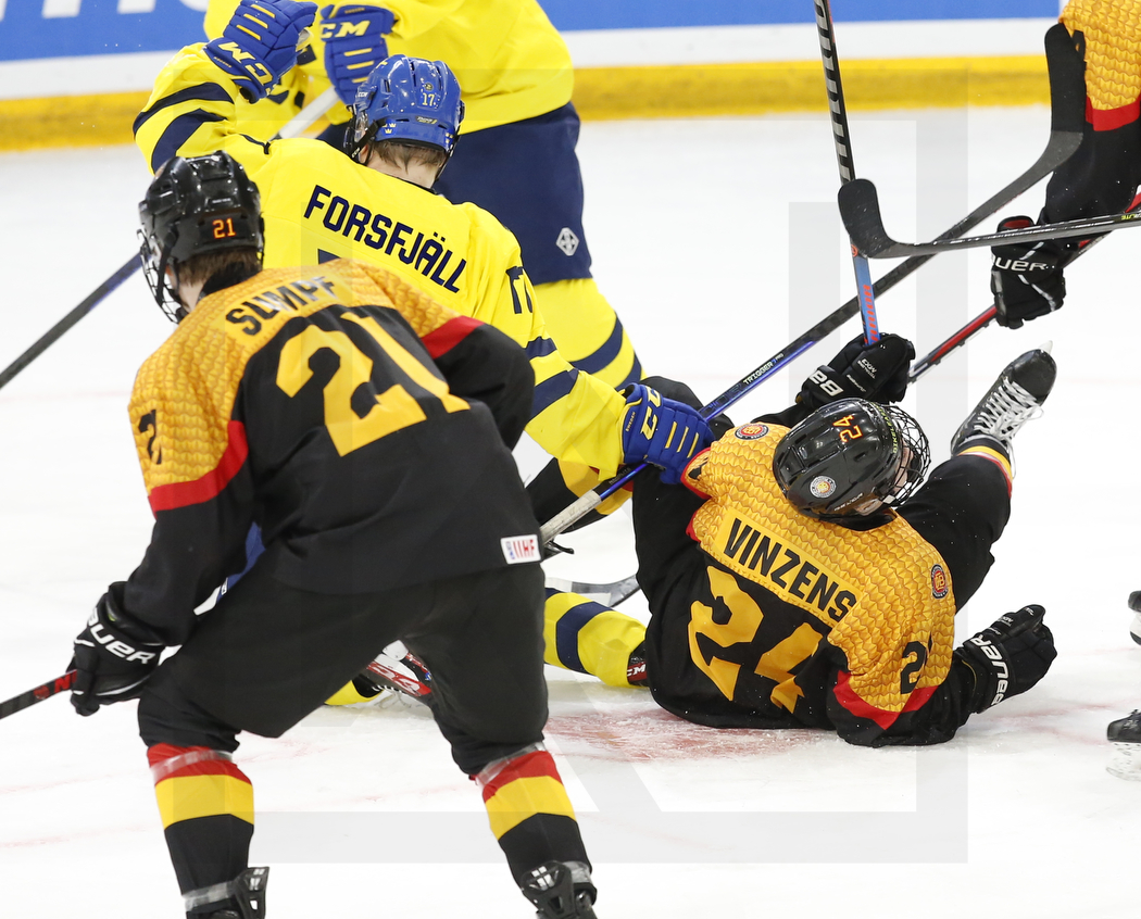 PORRENTRUY, SWITZERLAND, 25.Apr. 2023 – U18 World’s; SWE vs. GER. Image shows Julius SUMPF #21 (Germany), Zeb FORSFJÄLL #17 (Sweden) & Paul VINZENS #24 (Germany). Photo: Werner Krainbucher