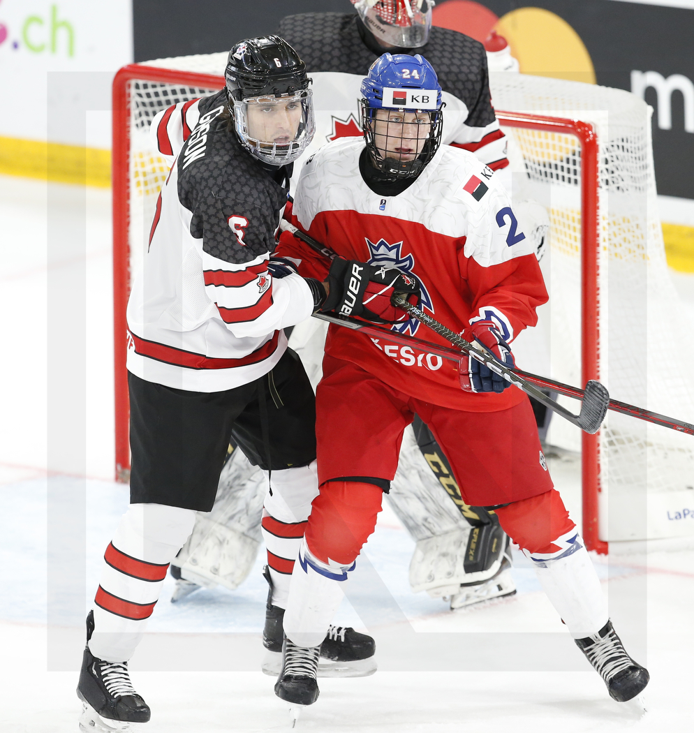 WK20230425_1245 25. April 2023 994 × 1050 WK20230425_1245 PORRENTRUY, SWITZERLAND, 25.Apr. 2023 – U18 World’s; CZE vs. CAN. Image shows Andrew GIBSON #6 (Canada) & Jakub STANCL #24 (Czech Republic). Photo: Werner Krainbucher