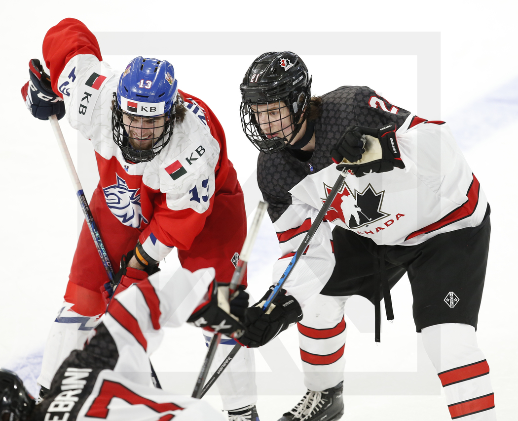 WK20230425_1442 25. April 2023 1050 × 852 WK20230425_1442 PORRENTRUY, SWITZERLAND, 25.Apr. 2023 – U18 World’s; CZE vs. CAN. Image shows Adam ZIDLICKY #13 (Czech Republic) & Calum RITCHIE #21 (Canada). Photo: Werner Krainbucher
