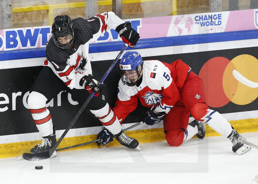 PORRENTRUY, SWITZERLAND, 25.Apr. 2023 – U18 World’s; CZE vs. CAN. Image shows Ty HALABURDA #8 (Canada) & Adam JIRICEK #5 (Czech Republic). Photo: Werner Krainbucher
