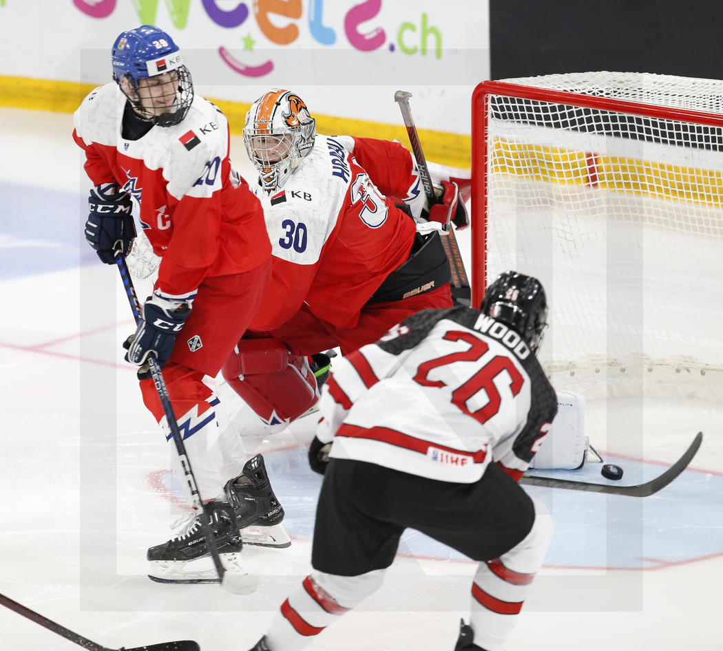 PORRENTRUY, SWITZERLAND, 25.Apr. 2023 – U18 World’s; CZE vs. CAN. Image shows Jakub DVORAK #20 (Czech Republic), Michael HRABAL #30 (Czech Republic) & Matthew WOOD #26 (Canada). Photo: Werner Krainbucher