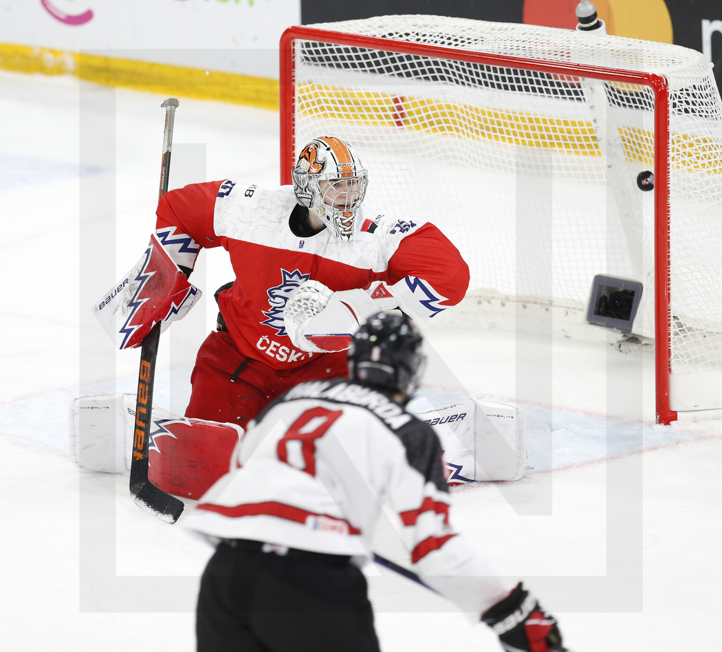PORRENTRUY, SWITZERLAND, 25.Apr. 2023 – U18 World’s; CZE vs. CAN. Image shows Ty HALABURDA #8 (Canada) beating Michael HRABAL #30 (Czech Republic) for the 5th Canadian goal. Photo: Werner Krainbucher