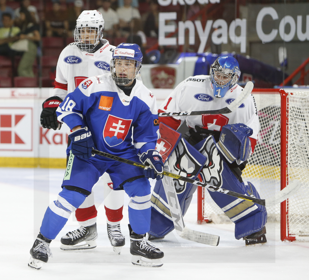 TRENCIN, SLOVAKIA, Pavol Demitra Ice Stadium, 31.Jul. 2023 – Preliminary Round, SVK vs. SUI. Image shows Yannik PONZETTO #28 (Switzerland), Michal LISCINSKY #18 (Slovakia) & Christian KIRSCH #1 (Switzerland). Photo: © Werner Krainbucher