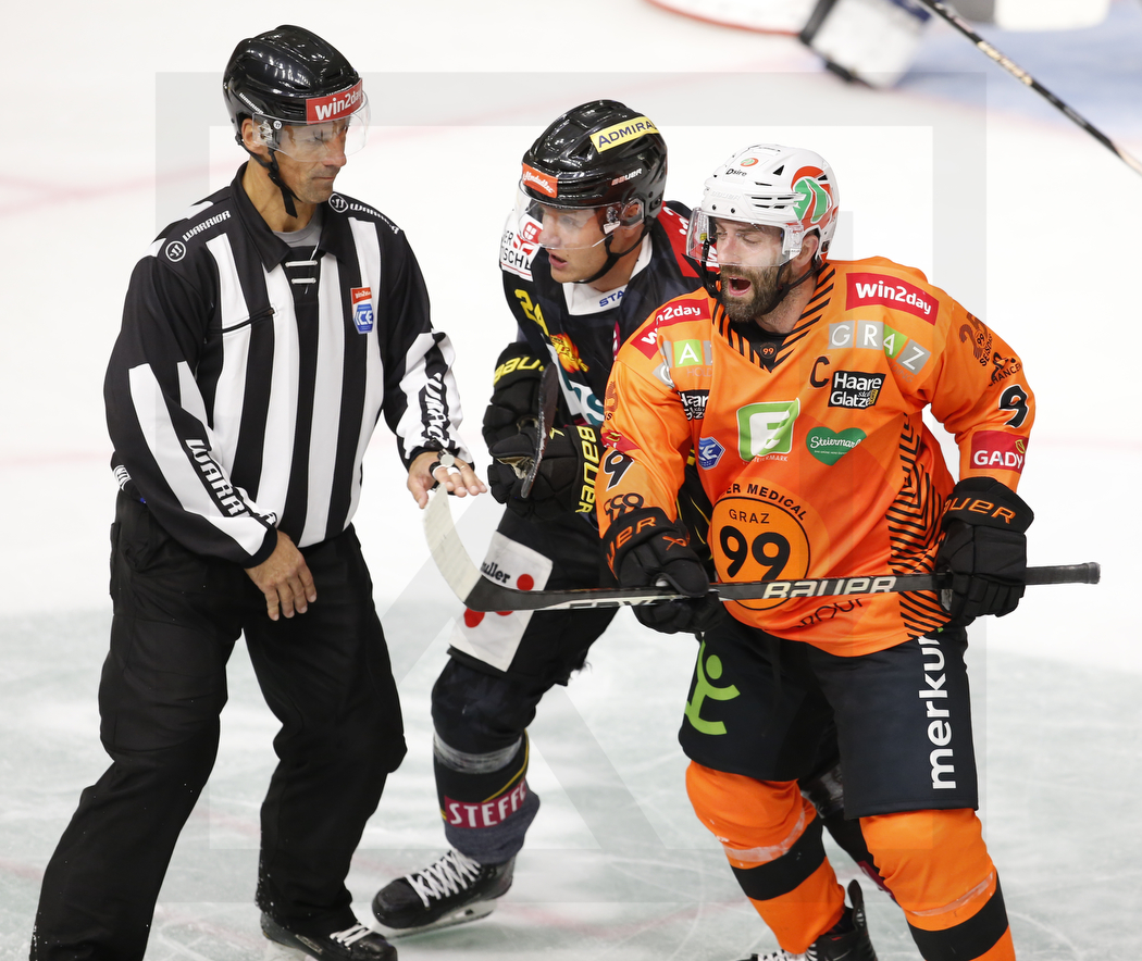 GRAZ, AUSTRIA, 15.Sep. 2023 – Moser Medical Graz 99ers vs. spusu Vienna Capitals. Image shows Hampus ERIKSSON #24 (spusu Vienna Capitals) & Taylor MATSON #9 (Moser Medical Graz 99ers). Photo: Werner Krainbucher