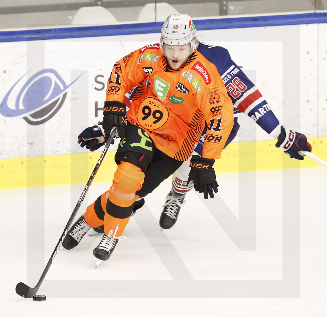 WK20231124_0721 24. November 2023 1050 × 1016 WK20231124_0721 GRAZ, AUSTRIA, 24.Nov. 2023 – Moser Medical Graz 99ers vs. Hydro Fehervar AV 19. Image shows Renars KRASTENBERGS #11 (Moser Medical Graz 99ers) & Daniel LEAVENS #26 (Hydro Fehervar AV 19). Photo: Werner Krainbucher