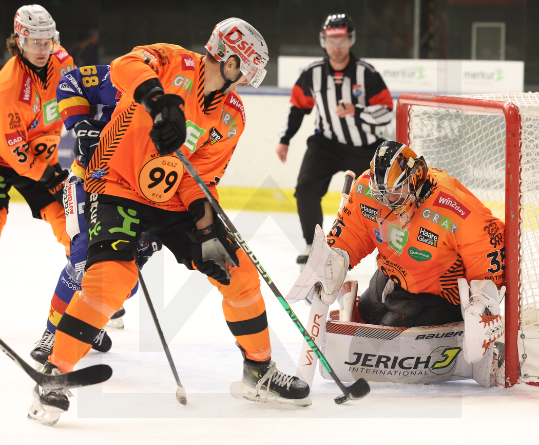 GRAZ, AUSTRIA, 28.Nov. 2023 – Moser Medical Graz 99ers vs. Migross Supermercati Asiago. Image shows Gustav BOURAMMAN #37 (Moser Medical Graz 99ers), Michele MARCHETTI #68 (Migross Supermercati Asiago), Renars KRASTENBERGS #11 (Moser Medical Graz 99ers) & Lars VOLDEN #35 (Moser Medical Graz 99ers). Photo: Werner Krainbucher