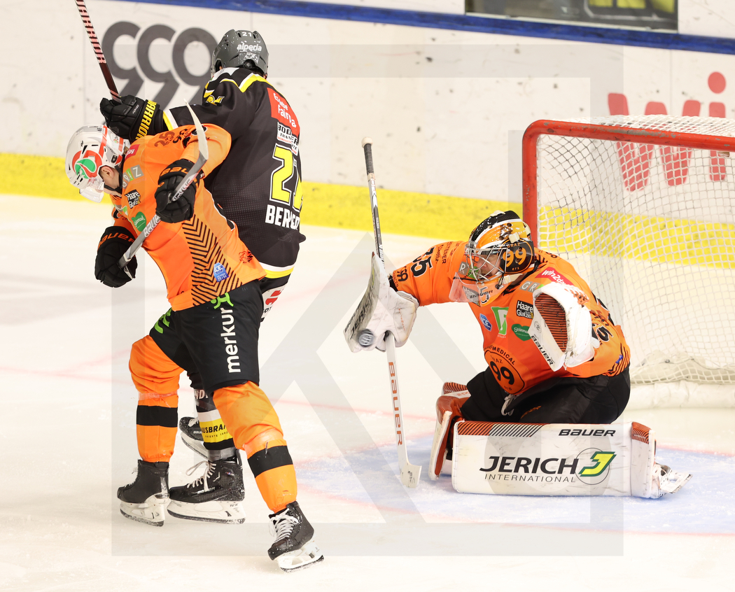 GRAZ, AUSTRIA, 08.Dec. 2023 – Moser Medical Graz 99ers vs. HC Pustertal Wölfe. Image shows Michael KERNBERGER #65 (Moser Medical Graz 99ers), Simon BERGER #21 (HC Pustertal Wölfe) & Lars VOLDEN #35 (Moser Medical Graz 99ers). Photo: Werner Krainbucher