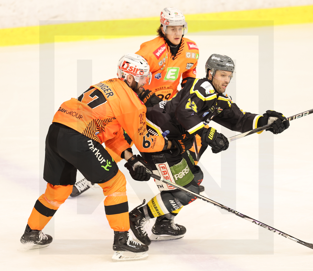 GRAZ, AUSTRIA, 08.Dec. 2023 – Moser Medical Graz 99ers vs. HC Pustertal Wölfe. Image shows Patrick KITTINGER #67 (Moser Medical Graz 99ers), Gustav BOURAMMAN #37 (Moser Medical Graz 99ers) & Richard John SCHOFIELD #23 (HC Pustertal Wölfe). Photo: Werner Krainbucher