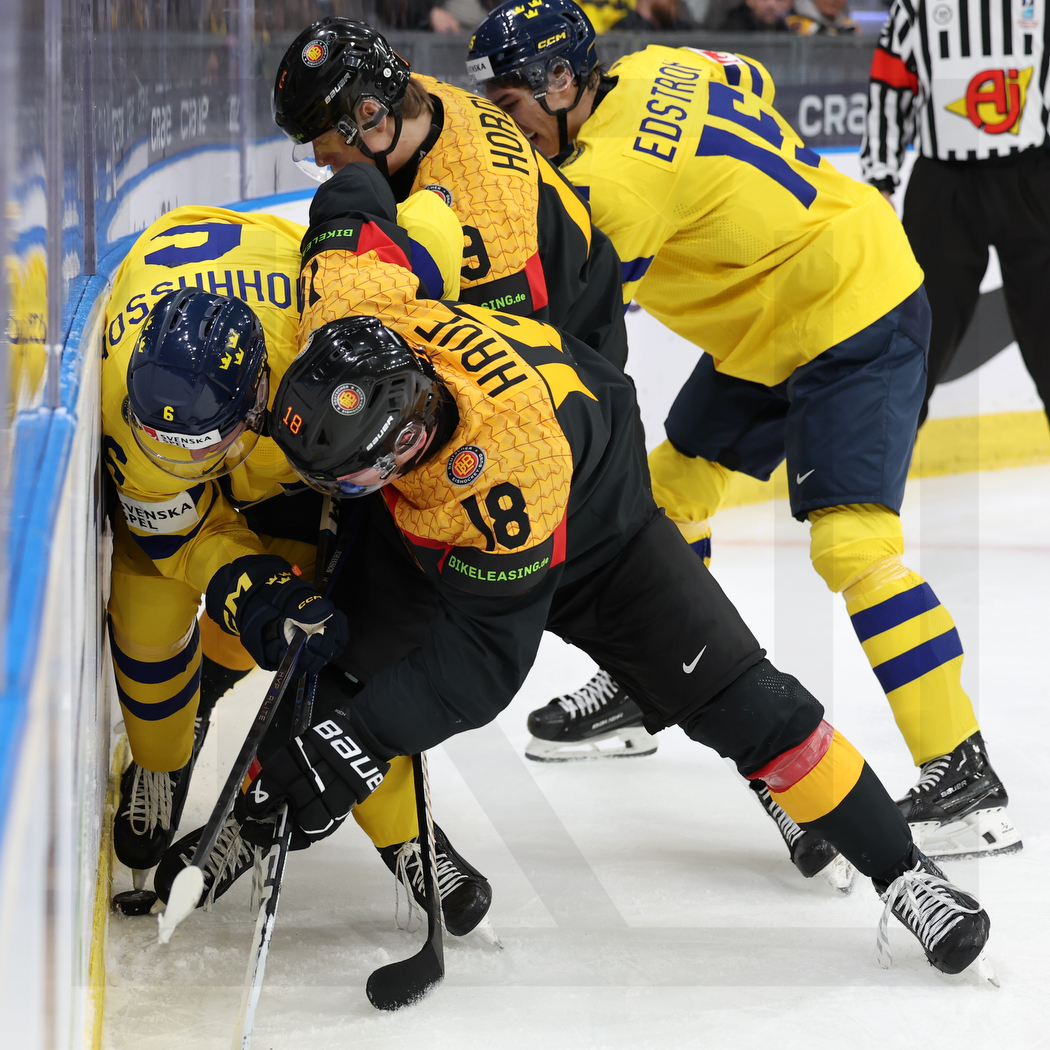 GOTHENBURG, SWEDEN, 28.Dec. 2023 – World Juniors, GER vs. SWE. Image shows Anton JOHANSSON #6 (Sweden), Luca HAUF #18 (Germany), Eric HÖRDLER #19 (Germany) & David EDSTRÖM #15 (Sweden). Photo: Werner Krainbucher