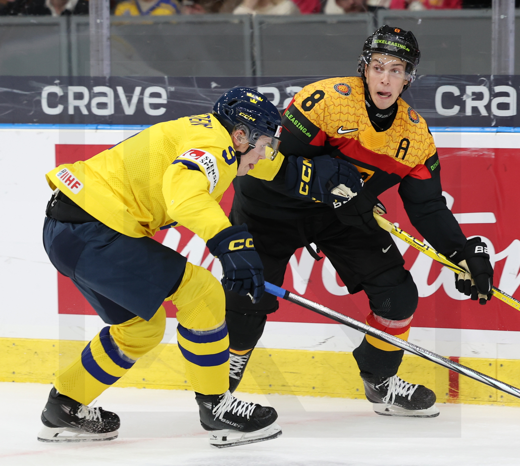 WK20231228_0635 28. Dezember 2023 1050 × 940 WK20231228_0635 GOTHENBURG, SWEDEN, 28.Dec. 2023 – World Juniors, GER vs. SWE. Image shows Theo LINDSTEIN #9 (Sweden) & Julian LUTZ #8 (Germany). Photo: Werner Krainbucher