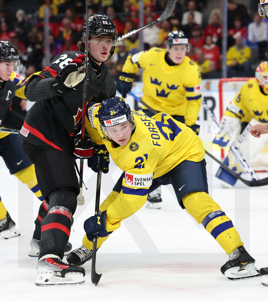 WK20231229_2023 29. Dezember 2023 934 × 1050 WK20231229_2023 GOTHENBURG, SWEDEN, 29.Dec. 2023 – World Juniors, CAN vs. SWE. Image shows Conor GEEKIE #28 (Canada) & Zeb FORSFJÄLL #21 (Sweden). Photo: Werner Krainbucher