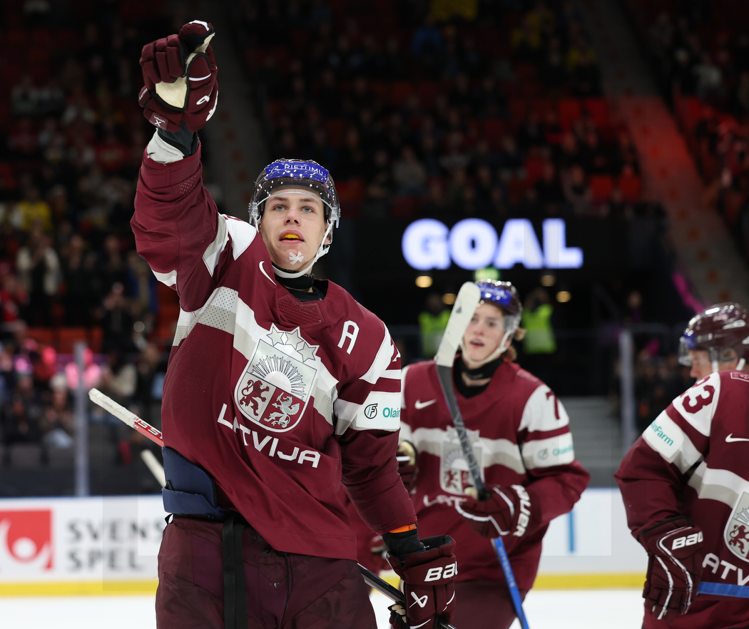 WK20231230_0633 30. Dezember 2023 1050 × 882 WK20231230_0633 GOTHENBURG, SWEDEN, 30.Dec. 2023 – World Juniors, GER vs. LAT. Image shows Sandis VILMANIS #22 (Latvia) rising his hand after his goal. Photo: Werner Krainbucher
