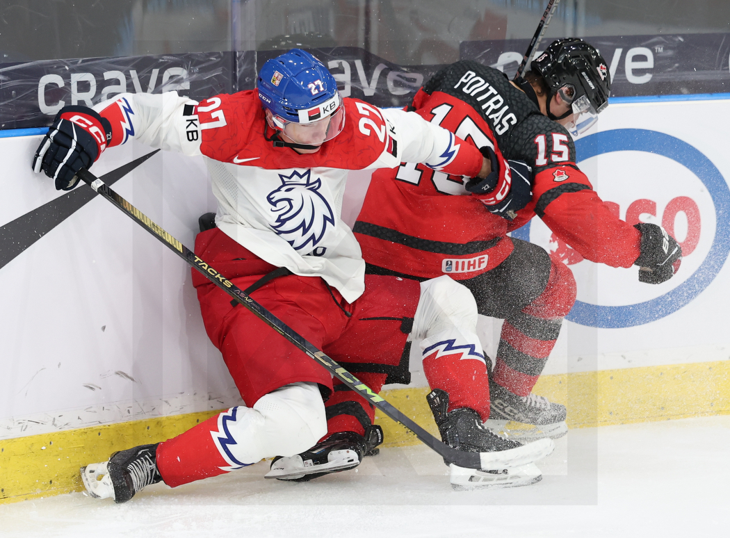 GOTHENBURG, SWEDEN, 02.Jan. 2024 – World Juniors, Quarterfinals, CAN vs. CZE. Image shows Marek ALSCHER #27 (Czech Republic) & Matthew POITRAS #15 (Canada). Photo: Werner Krainbucher