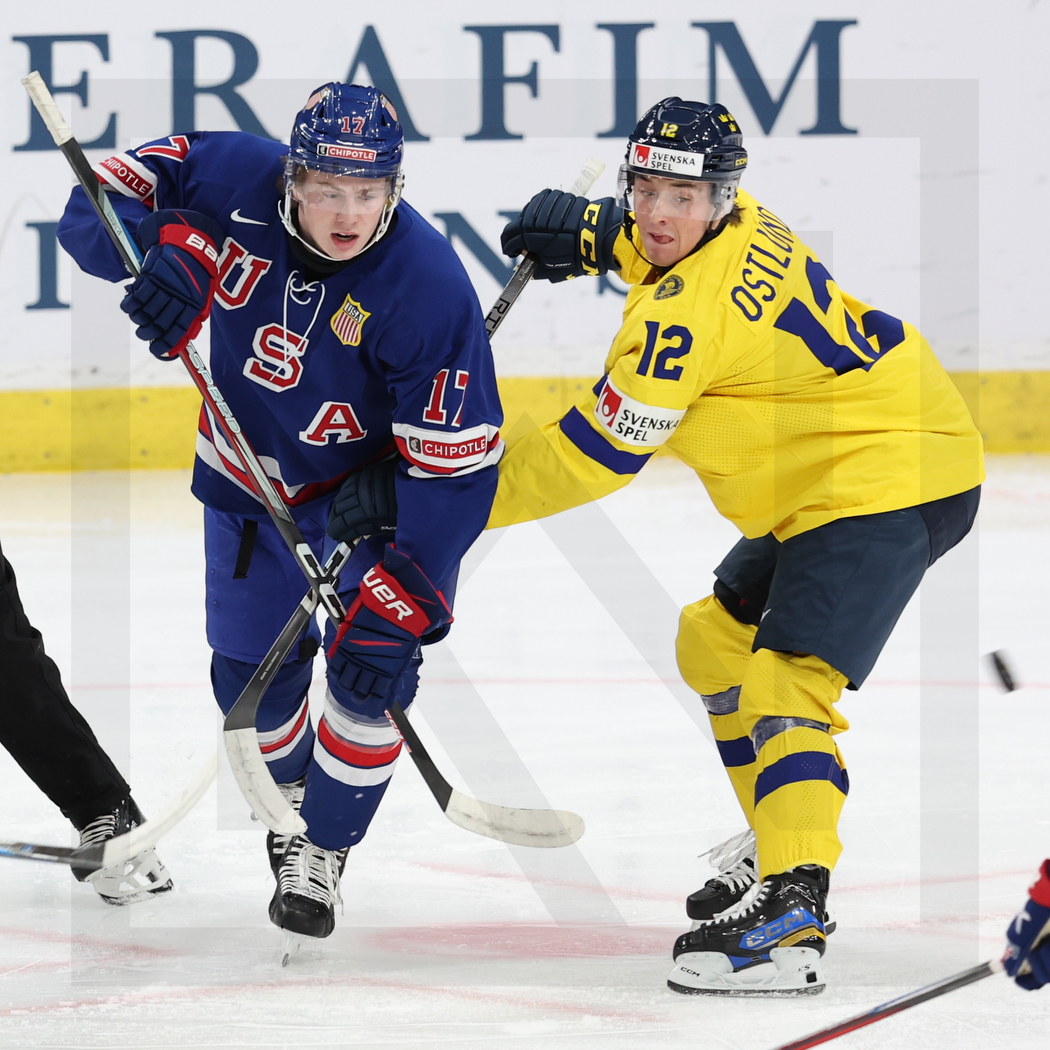 WK20240105_0123 5. Januar 2024 1050 × 1050 WK20240105_0123 GOTHENBURG, SWEDEN, 05.Jan. 2024 – World Juniors, Gold Medal Game, USA vs. SWE. Image shows Danny NELSON #17 (USA) & Noah ÖSTLUND #12 (Sweden). Photo: Werner Krainbucher
