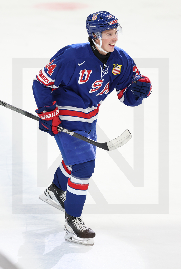 GOTHENBURG, SWEDEN, 05.Jan. 2024 – World Juniors, Gold Medal Game, USA vs. SWE. Image shows Gabe PERREAULT #34 (USA) after his goal. Photo: Werner Krainbucher