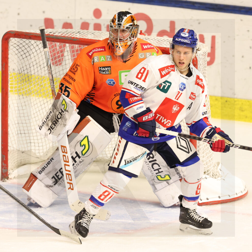 GRAZ, AUSTRIA, 12.Jan. 2024 – Moser Medical Graz 99ers vs. HC TIWAG Innsbruck. Image shows Lars VOLDEN #35 (Moser Medical Graz 99ers) & Corey MACKIN #81 (HC TIWAG Innsbruck). Photo: Werner Krainbucher