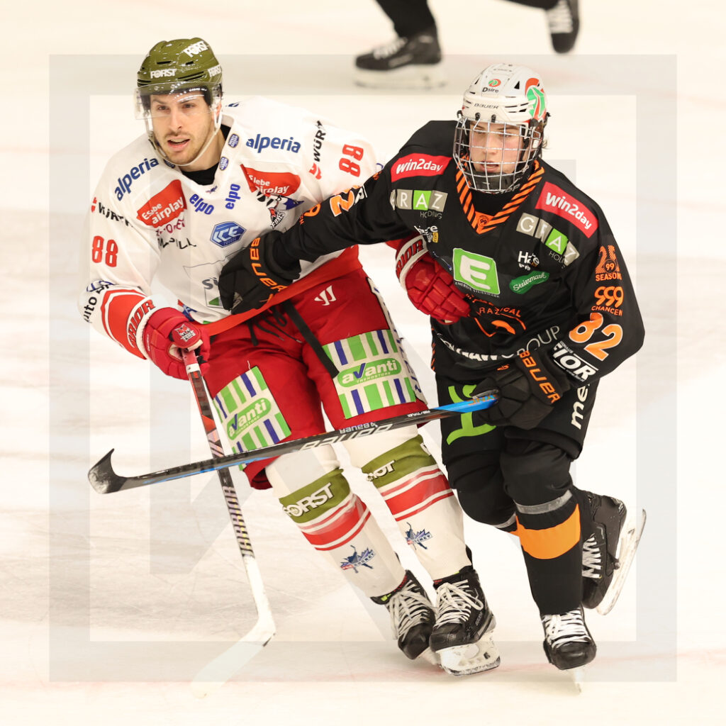 GRAZ, AUSTRIA, 21.Feb. 2024 – Moser Medical Graz 99ers vs. HCB Südtirol Alperia. Image shows Domenico ALBERGA #88 (HCB Südtirol Alperia) & Paul REINER #82 (Moser Medical Graz 99ers). Photo: Werner Krainbucher