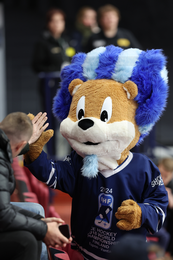 WK20240425_0574 25. April 2024 700 × 1050 WK20240425_0574 VANTAA, FINLAND, 25.Apr. 2024 – U18 World’s; CZE vs. SUI. Image shows mascot. Photo: Werner Krainbucher
