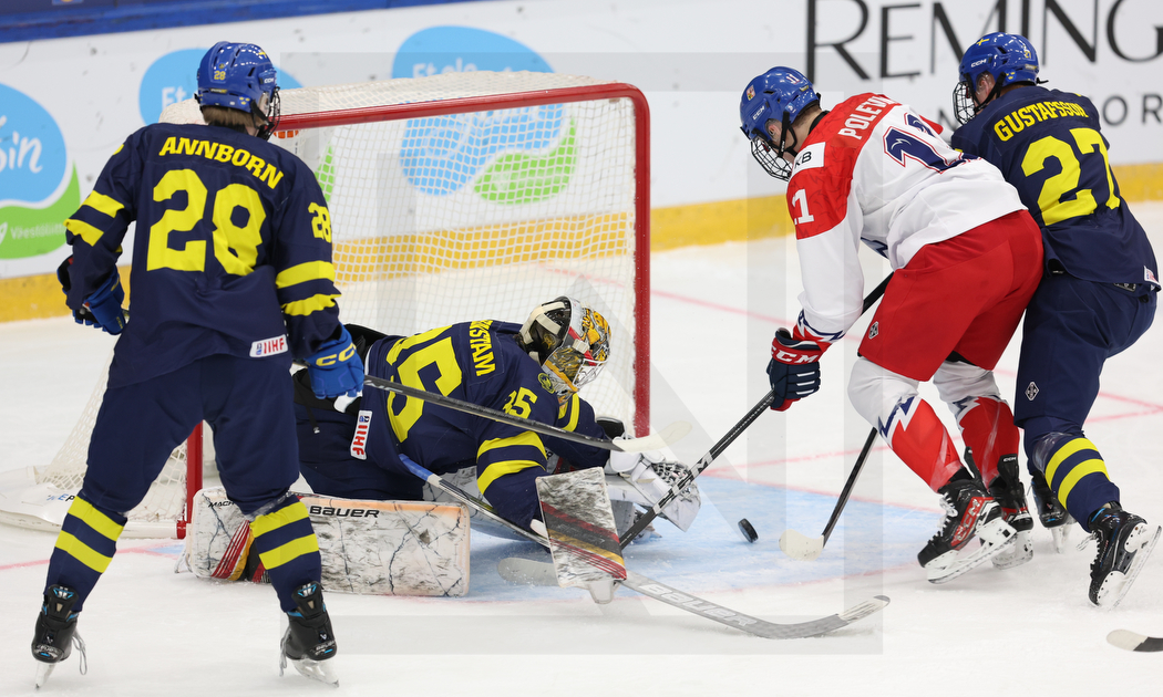 VANTAA, FINLAND, 28.Apr. 2024 – U18 World’s; SWE vs. CZE . Image shows Karl ANNBORN #28 (Sweden), Love HÄRENSTAM #35 (Sweden), Tomas POLETIN #11 (Czech Republic) & Viggo GUSTAFSSON #27 (Sweden). Photo: Werner Krainbucher