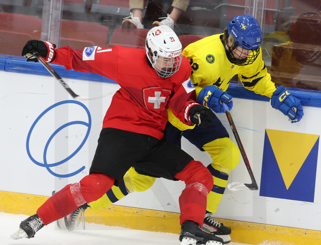 WK20240430_0549 30. April 2024 1050 × 802 WK20240430_0549 VANTAA, FINLAND, 30.Apr. 2024 – U18 World’s; SUI vs. SWE. Image shows Mischa GEISSER #21 (Switzerland) & Karl STERNER #22 (Sweden). Photo: Werner Krainbucher