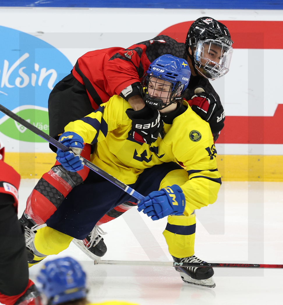 WK20240504_2027 4. Mai 2024 972 × 1050 WK20240504_2027 ESPOO, FINLAND, 04.May. 2024 – U18 World’s; Semifinal, CAN vs. SWE. Image shows Victor EKLUND #18 (Sweden) & Tij IGINLA #24 (Canada). Photo: Werner Krainbucher