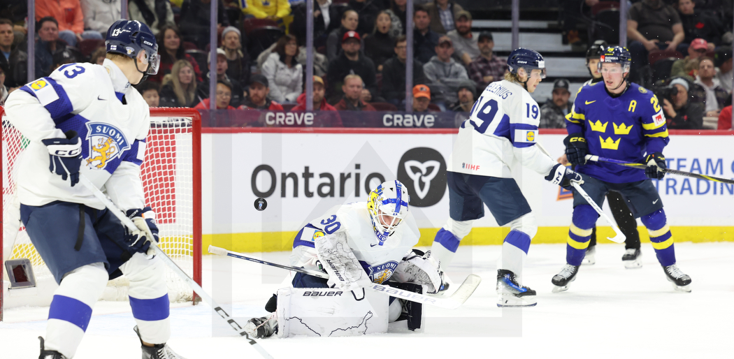 OTTAWA, CANADA, 04.Jan. 2025 – World Juniors, Semifinals, SWE vs. FIN. Image shows Veto VÄISÄNEN #13 (Finland), Petteri RIMPINEN #30 (Finland), Konsta HELENIUS #19 (Finland) & Otto STENBERG #25 (Sweden). Photo: Werner Krainbucher (Puckfans.at)
