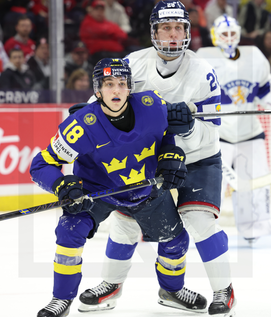 OTTAWA, CANADA, 04.Jan. 2025 – World Juniors, Semifinals, SWE vs. FIN. Image shows Victor EKLUND #18 (Sweden) & Heikki RUOHONEN #28 (Finland). Photo: Werner Krainbucher (Puckfans.at)