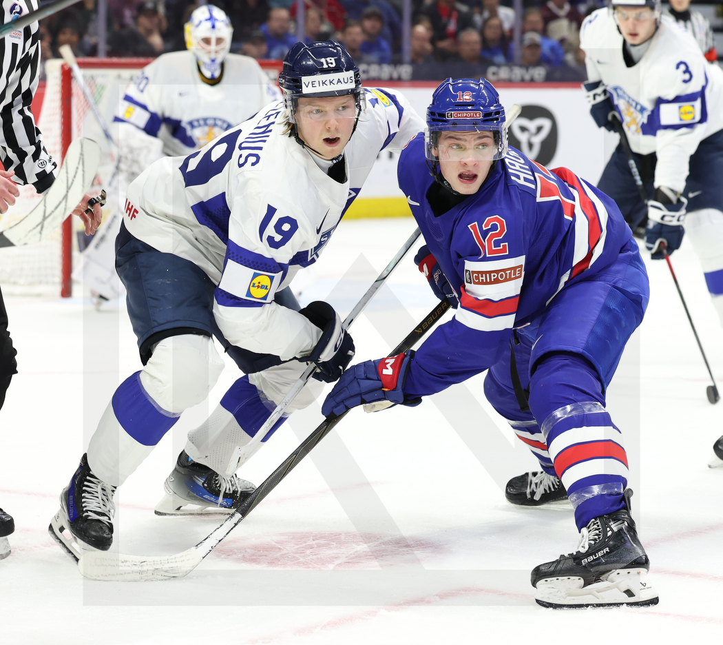OTTAWA, CANADA, 05.Jan. 2025 – World Juniors, Gold Medal Game, USA vs. FIN. Image shows Konsta HELENIUS #19 (Finland) & James HAGENS #12 (USA). Photo: Werner Krainbucher (Puckfans.at)