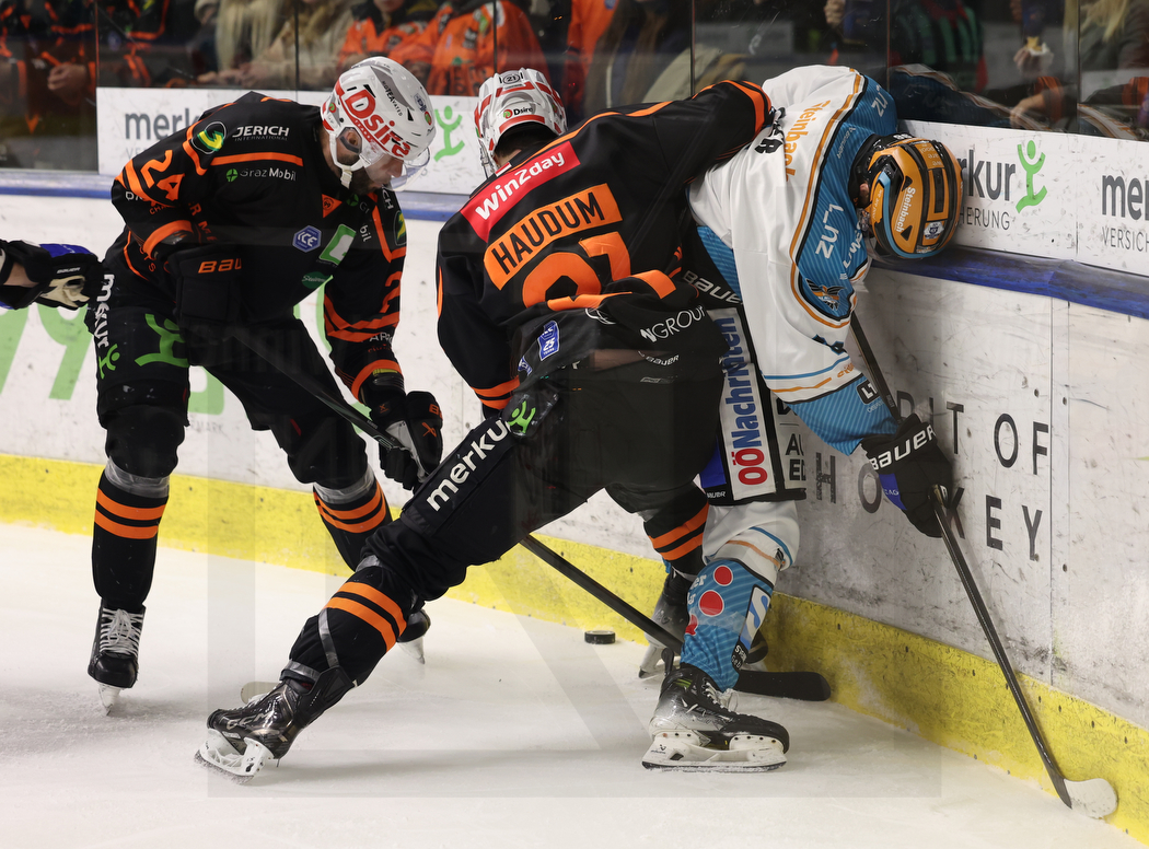 GRAZ, AUSTRIA, 14.Mar. 2025 – Moser Medical Graz 99ers vs. Steinbach Black Wings Linz. Image shows Rok TICAR #24 (Moser Medical Graz 99ers), Lukas HAUDUM #21 (Moser Medical Graz 99ers) & Christoph TIALLER #96 (Steinbach Black Wings Linz). Photo: Werner Krainbucher
