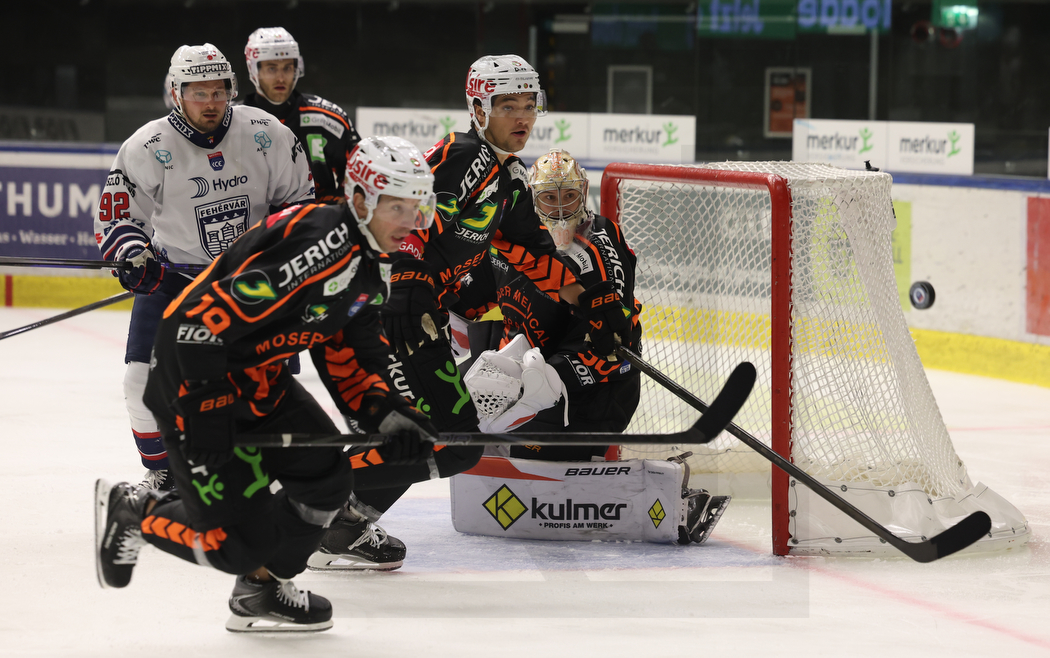GRAZ, AUSTRIA, 23, Sep, 2025, Moser Medical Graz 99ers vs. Hydro Fehervar AV 19. Image shows Anze KURALT #92 (Hydro Fehervar AV 19), Nick BAILEN #7 (Moser Medical Graz 99ers), Lukas KAINZ #19 (Moser Medical Graz 99ers), Frank HORA #3 (Moser Medical Graz 99ers) & Nicolas WIESER #30 (Moser Medical Graz 99ers). Photo: Werner Krainbucher