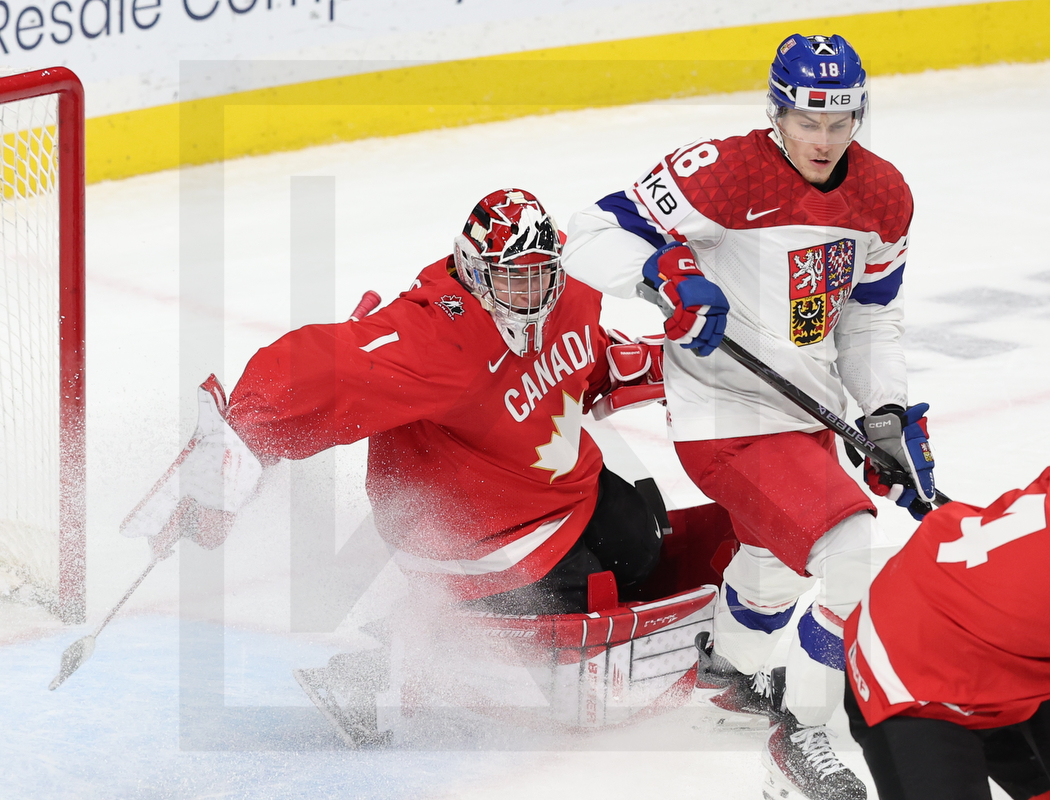 ST. PAUL, USA, 04, Jan, 2026, World Juniors, Semifinals, CAN vs. CZE. Image shows Jack IVANKOVIC #1 (Canada) & Tomas POLETIN #18 (Czech Republic). Photo: Werner Krainbucher (Puckfans.at)