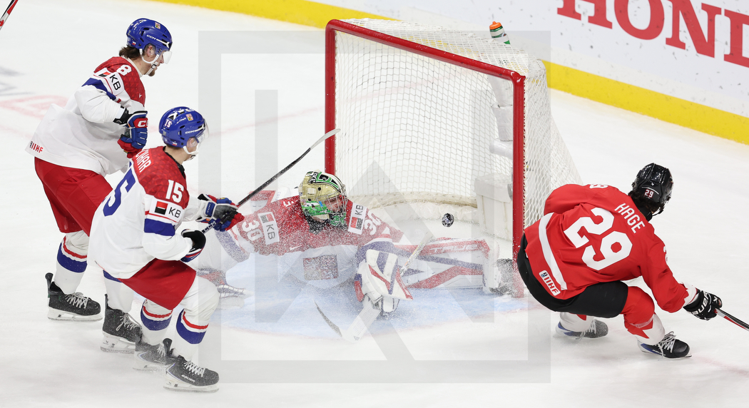ST. PAUL, USA, 04, Jan, 2026, World Juniors, Semifinals, CAN vs. CZE. Image shows Matyas MAN #8 (Czech Republic), Vojtech CIHAR #15 (Czech Republic), Michal ORSULAK #30 (Czech Republic) & Michael HAGE #29 (Canada). Photo: Werner Krainbucher (Puckfans.at)