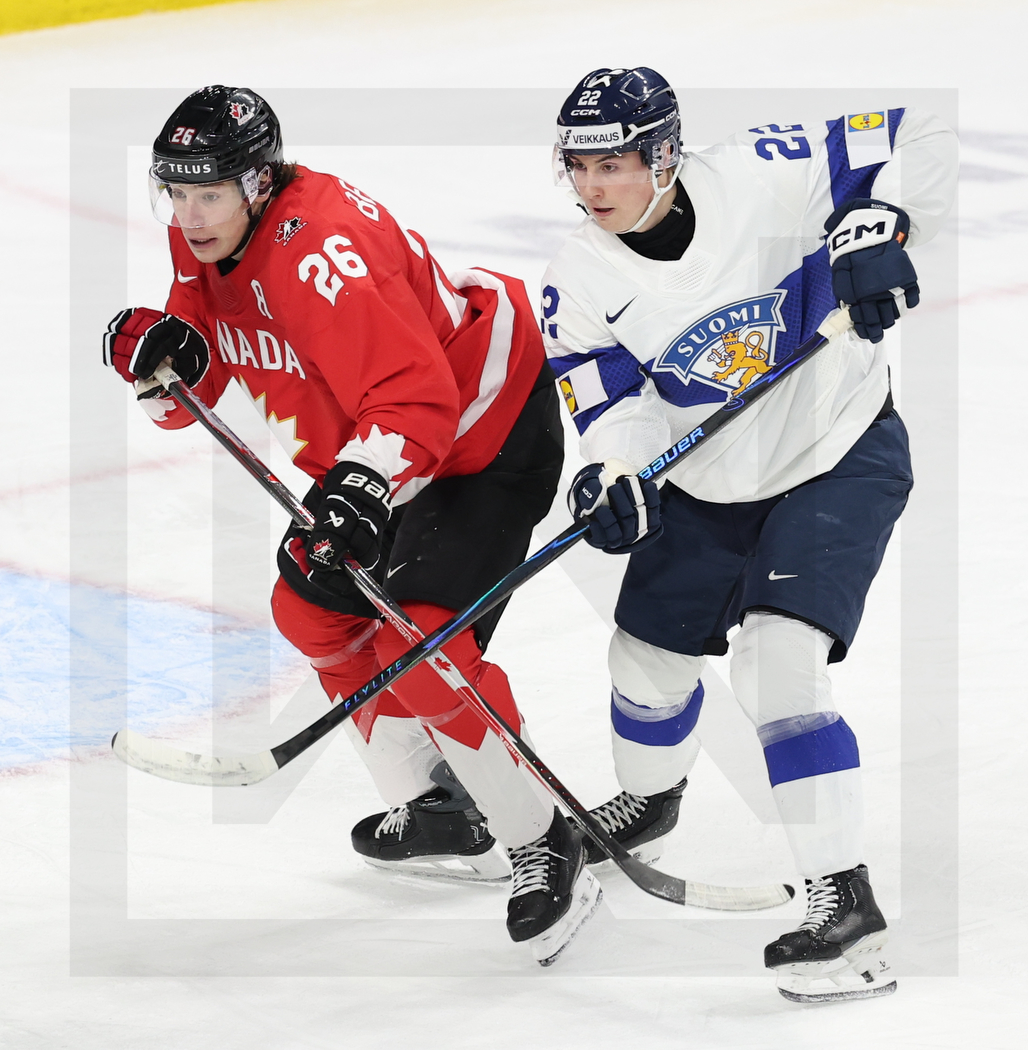 ST. PAUL, USA, 05, Jan, 2026, World Juniors, Bronze Medal Game, CAN vs. FIN. Image shows Cole BEAUDOIN #26 (Canada) & Emil HEMMING #22 (Finland). Photo: Werner Krainbucher (Puckfans.at)