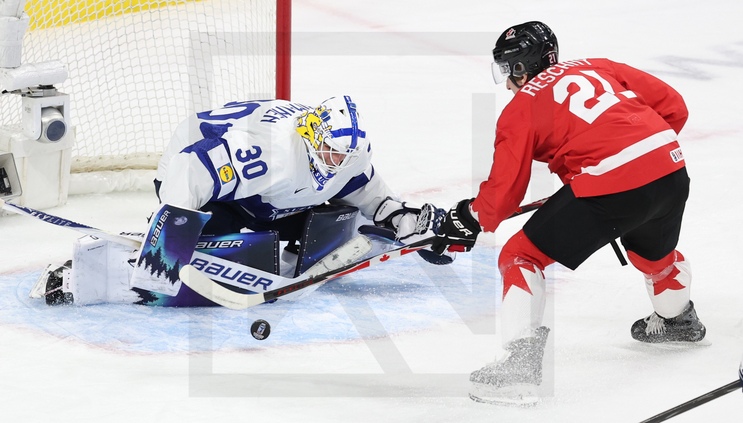 ST. PAUL, USA, 05, Jan, 2026, World Juniors, Bronze Medal Game, CAN vs. FIN. Image shows Petteri RIMPINEN #30 (Finland) & Cole RESCHNY #21 (Canada). Photo: Werner Krainbucher (Puckfans.at)