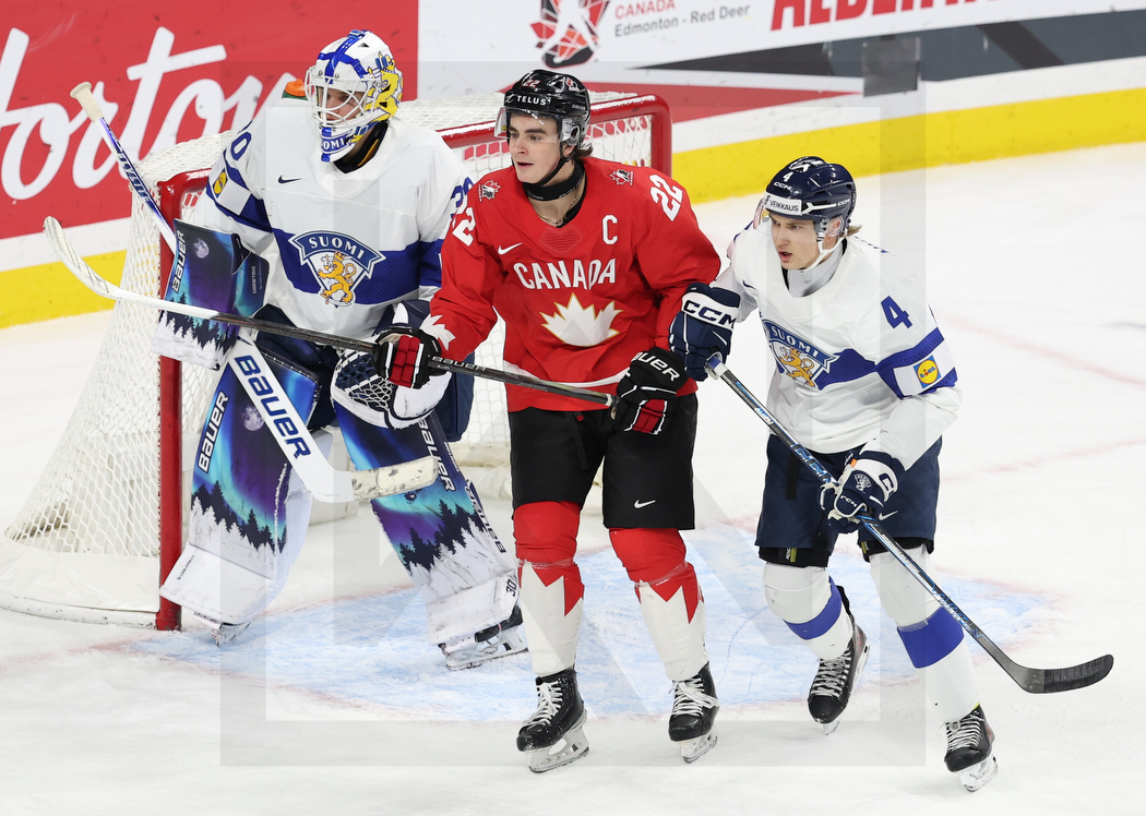 ST. PAUL, USA, 05, Jan, 2026, World Juniors, Bronze Medal Game, CAN vs. FIN. Image shows Petteri RIMPINEN #30 (Finland), Porter MARTONE #22 (Canada) & Niklas NYKYRI #4 (Finland). Photo: Werner Krainbucher (Puckfans.at)