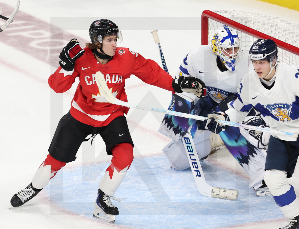 ST. PAUL, USA, 05, Jan, 2026, World Juniors, Bronze Medal Game, CAN vs. FIN. Image shows Gavin MCKENNA #9 (Canada), Petteri RIMPINEN #30 (Finland) & Leo TUUVA #23 (Finland). Photo: Werner Krainbucher (Puckfans.at)
