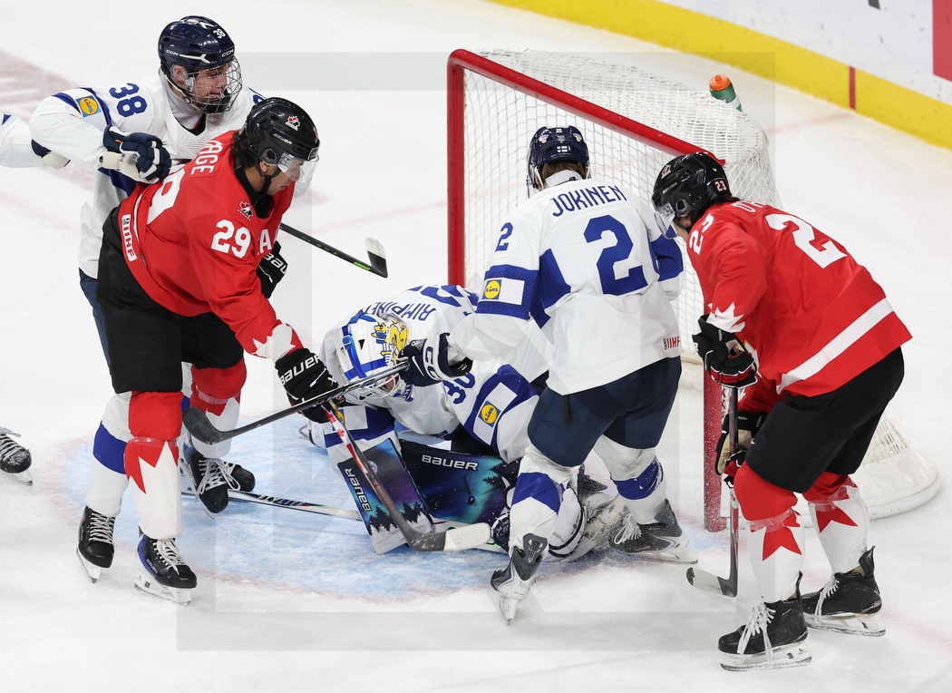 ST. PAUL, USA, 05, Jan, 2026, World Juniors, Bronze Medal Game, CAN vs. FIN. Image shows Oliver SUVANTO #38 (Finland), Michael HAGE #29 (Canada), Petteri RIMPINEN #30 (Finland), Mitja JOKINEN #2 (Finland) & Sam O’REILLY #23 (Canada). Photo: Werner Krainbucher (Puckfans.at)