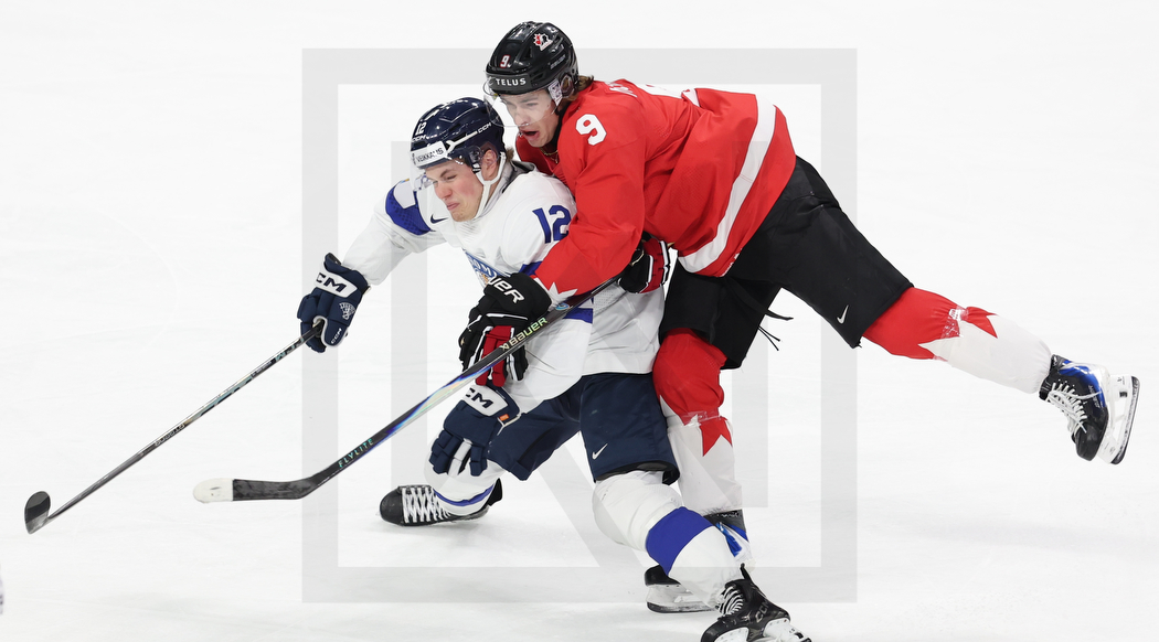ST. PAUL, USA, 05, Jan, 2026, World Juniors, Bronze Medal Game, CAN vs. FIN. Image shows Joona SAARELAINEN #12 (Finland) & Gavin MCKENNA #9 (Canada). Photo: Werner Krainbucher (Puckfans.at)
