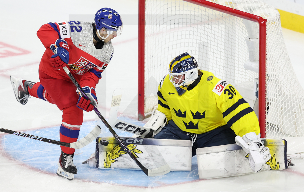ST. PAUL, USA, 05, Jan, 2026, World Juniors, Gold Medal Game, SWE vs. CZE. Image shows Adam TITLBACH #22 (Czech Republic) & Love HÄRENSTAM #30 (Sweden). Photo: Werner Krainbucher (Puckfans.at)