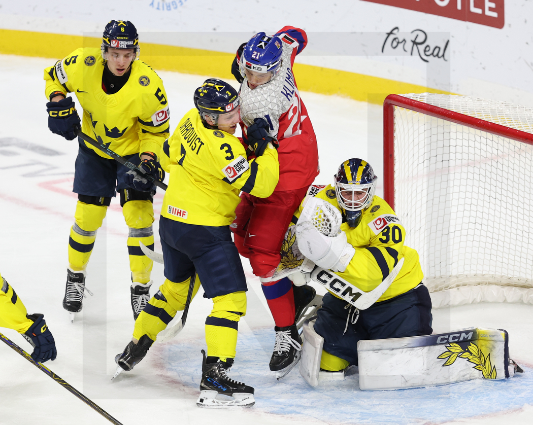 ST. PAUL, USA, 05, Jan, 2026, World Juniors, Gold Medal Game, SWE vs. CZE. Image shows Sascha BOUMEDIENNE #5 (Sweden), Felix ÖHRQVIST #3 (Sweden), Jiri KLIMA #21 (Czech Republic) & Love HÄRENSTAM #30 (Sweden). Photo: Werner Krainbucher (Puckfans.at)