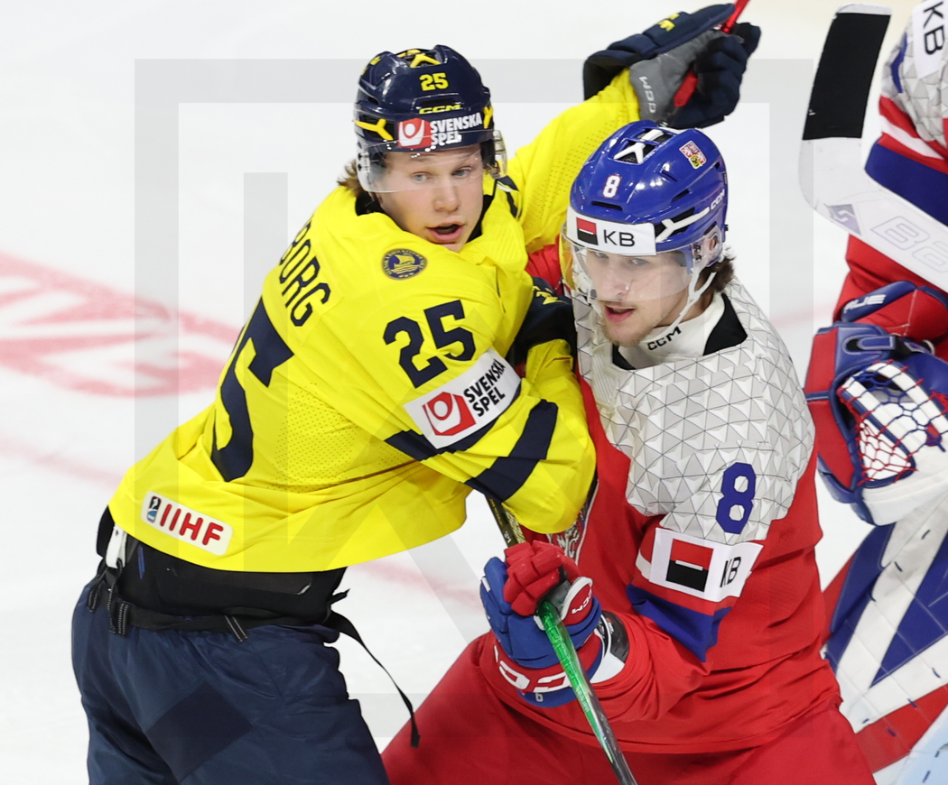 ST. PAUL, USA, 05, Jan, 2026, World Juniors, Gold Medal Game, SWE vs. CZE. Image shows Eddie GENBORG #25 (Sweden) & Matyas MAN #8 (Czech Republic). Photo: Werner Krainbucher (Puckfans.at)
