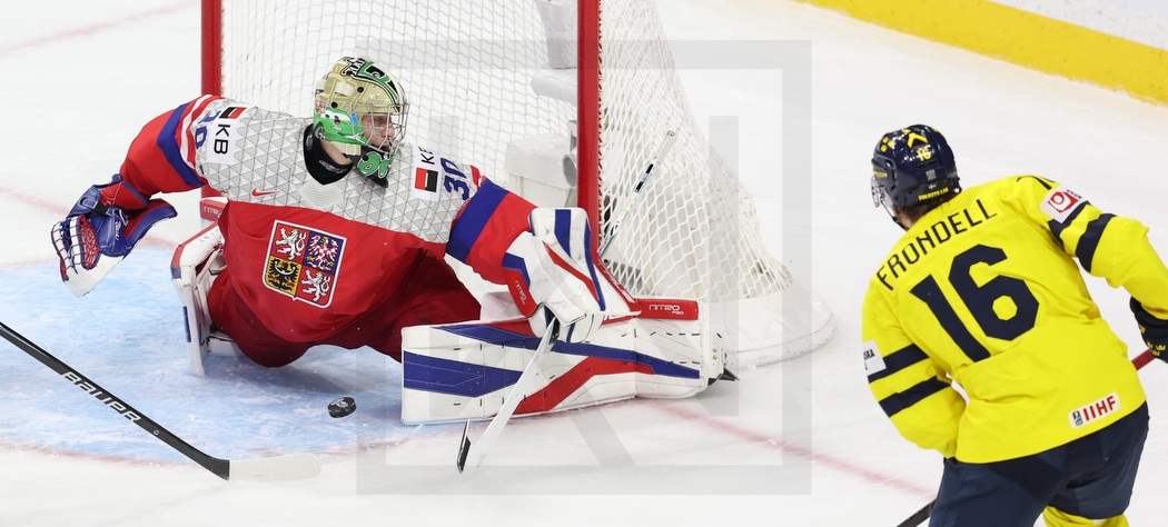 ST. PAUL, USA, 05, Jan, 2026, World Juniors, Gold Medal Game, SWE vs. CZE. Image shows Michal ORSULAK #30 (Czech Republic) & Anton FRONDELL #16 (Sweden). Photo: Werner Krainbucher (Puckfans.at)