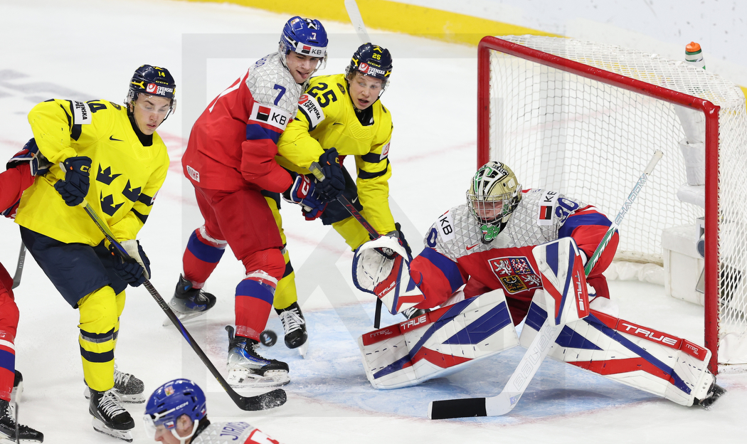 ST. PAUL, USA, 05, Jan, 2026, World Juniors, Gold Medal Game, SWE vs. CZE. Image shows Linus ERIKSSON #14 (Sweden), Jakub FIBIGR #7 (Czech Republic), Eddie GENBORG #25 (Sweden) & Michal ORSULAK #30 (Czech Republic). Photo: Werner Krainbucher (Puckfans.at)