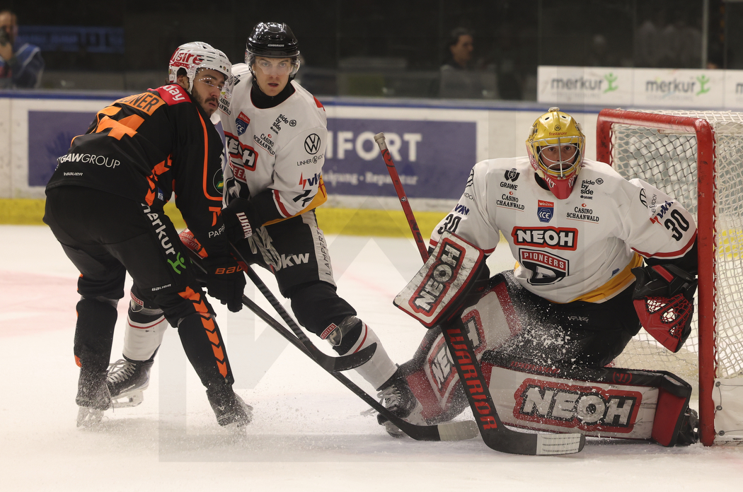 GRAZ, AUSTRIA, 30, Jan, 2026, Moser Medical Graz 99ers vs. Pioneers Vorarlberg. Image shows Nico FELDNER #74 (Moser Medical Graz 99ers), Eric FLORCHUK #14 (Pioneers Vorarlberg) & Alex CAFFI #30 (Bemer Pioneers Vorarlberg). Photo: Werner Krainbucher